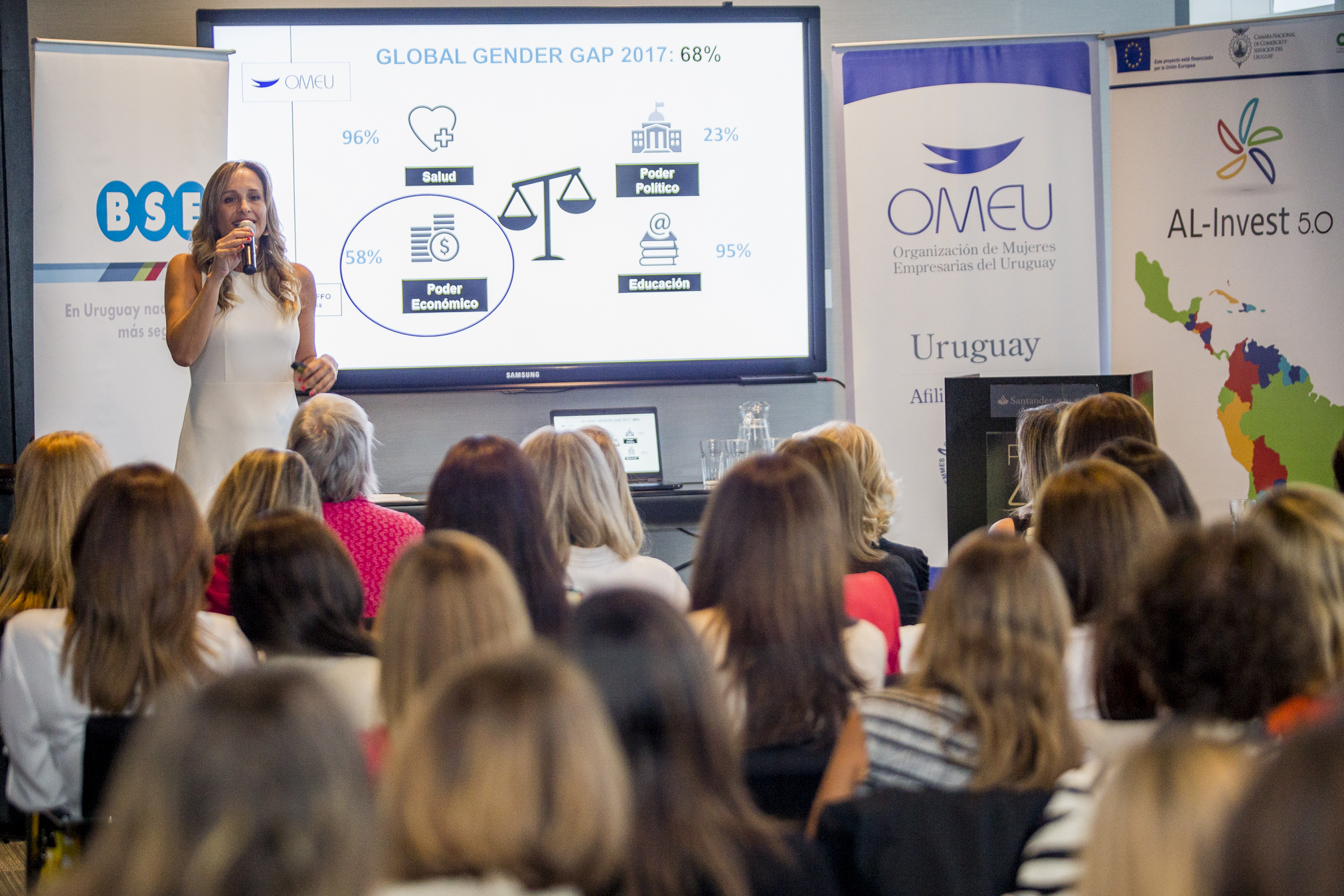 Raffo presentó cifras del 2017 sobre la brecha de género en las distintas industrias, a nivel mundial y local y explicó que en Uruguay continúa muy abierta, especialmente en el área de poder económico.